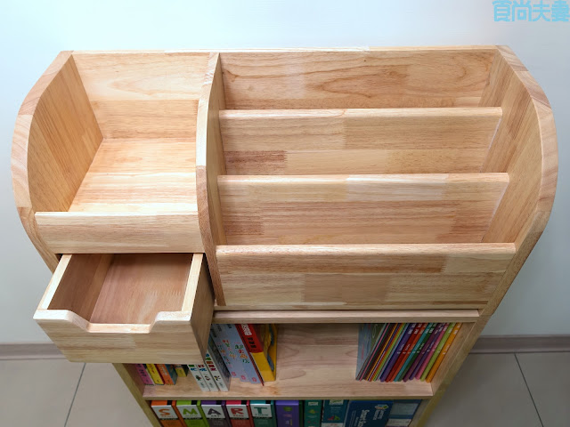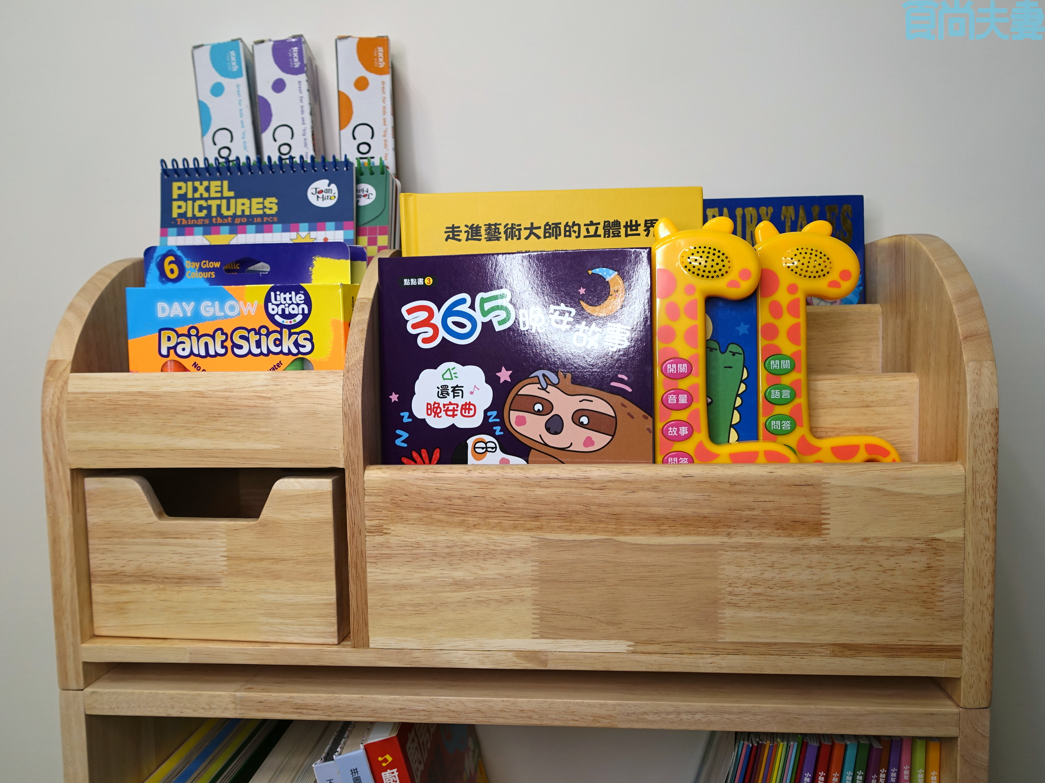 ↓【閱讀角】3格書格很像迷你雜誌架的設計,每格是5.5公分,可以放常看的書,邊邊是圓角設計,除了安全,也是非常可愛造型。