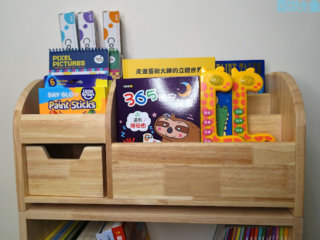 以環安這個【好好整理祖】中,上層【好好收書架】的高度就差不多在寶皇肩膀位置,收納空間有很明顯的3個角落區隔,方便孩子辨識,我目前規劃成右側【閱讀角】、左上【美勞角】、左下【玩具角】。