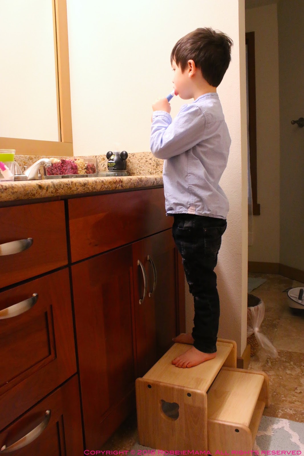 放在馬桶旁邊方便小孩上下如廁,或是洗臉盆方便他自己洗手、刷牙